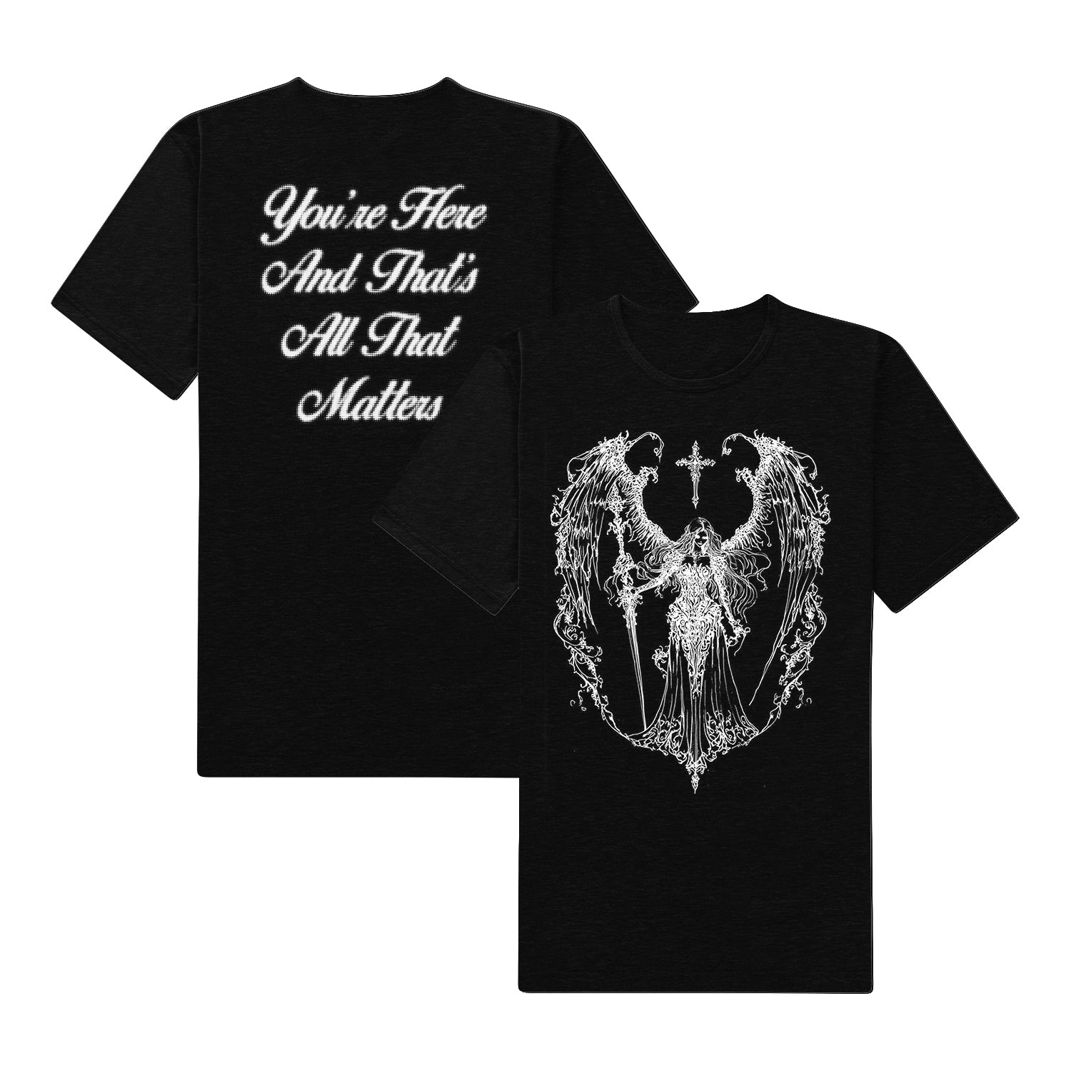 Black front and back t-shirt featuring a front print and the line "you're here and that's all that matters" on the back.